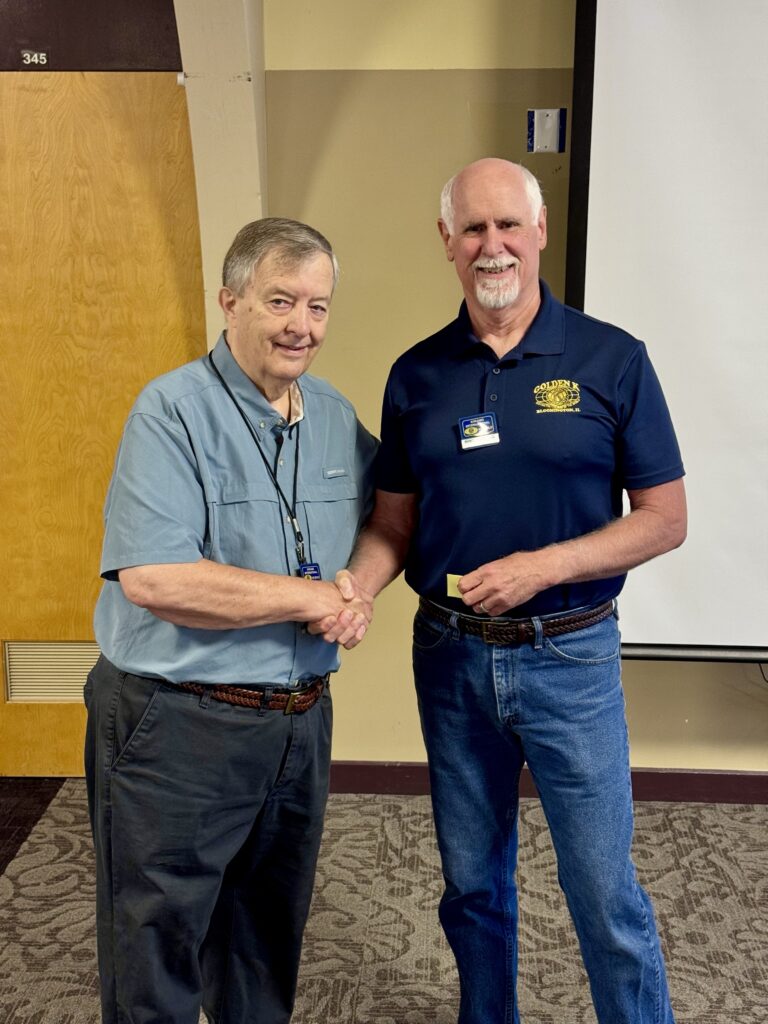 Outgoing President Larry Christy welcomes new Bloomington Golden K President Mike Carroll