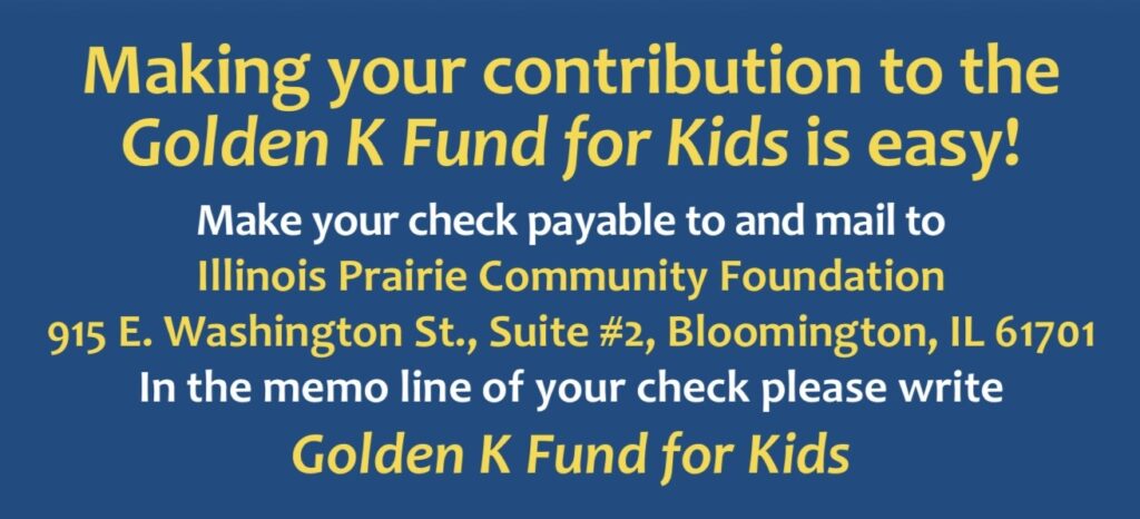 Help Bloomington Golden K Kiwanis help kids in our community. Donate to the Golden K Fund for Kids at the Illinois Prairie Community Foundation. Click on the link below to be taken to the Foundation website for online contributions.